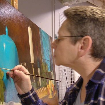 usually on oil-primed linen. I first develop the composition in detailed drawings, then a value study. I create the underpainting in oil, over which I put down thin layers of color. The glazes accumulate to build depth in the objects and complexity of light and dark.
